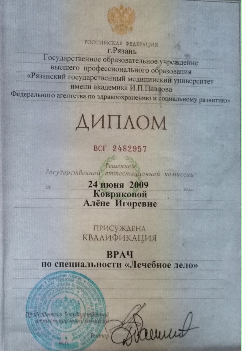 Диплом о присуждении квалификации врач по специальности «Лечебное дело»»