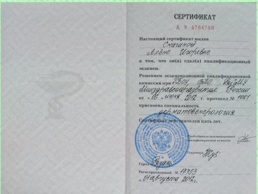 Образование: 2009 год – окончила Рязанский Государственный Медицинский Университет, факультет «лечебное дело». 2011 год – прошла ординатуру по специальности «Дерматология» в Рязанском Кожно-Венерологическом Диспансере. 2013 год – прошла переподготовку по специальности «Микология» в РМАПО, г. Москва. 2014 год – получила сертификат «Врач-косметолог» после обучения в МОНИКИ, г. Москва. 2015-2025 годы – проходила курсы журналистики, SMM-продвижения, маркетинга, тренинги для копирайтеров и редакторов.