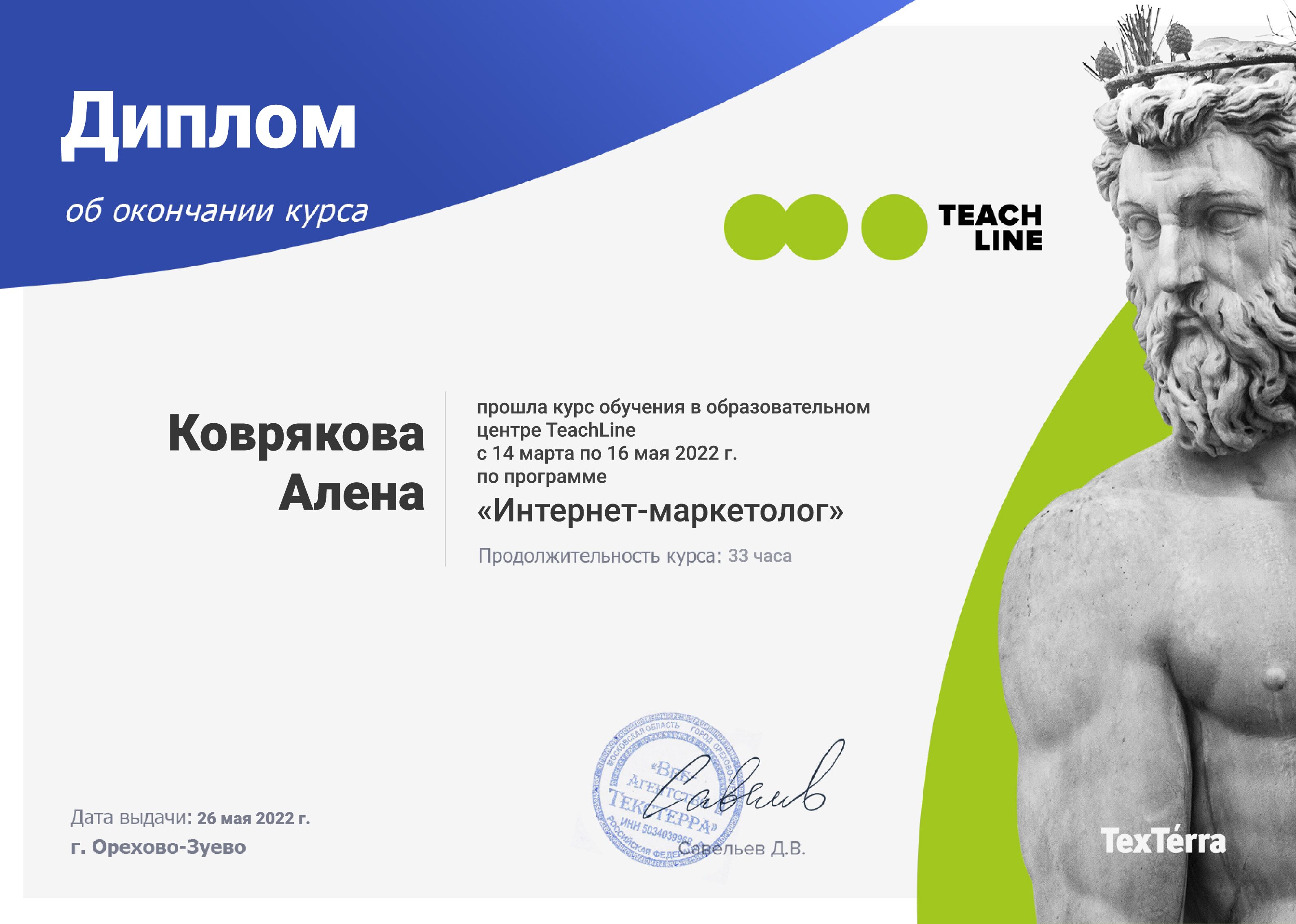 Диплом об окончании курса по программе «Интернет-маркетолог»